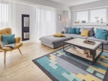 Eine kleine Langmatte unterstreicht den zentralen Teil des Wohnzimmers. Designer ungewöhnliche Annäherung an das Thema Farbe: Schattierungen werden von einer Palette genommen, der Schwerpunkt liegt auf der Dekoration von Stühlen. Die Bodenmatte zieht wenig Aufmerksamkeit auf sich, betont aber den Tisch der ursprünglichen Form.