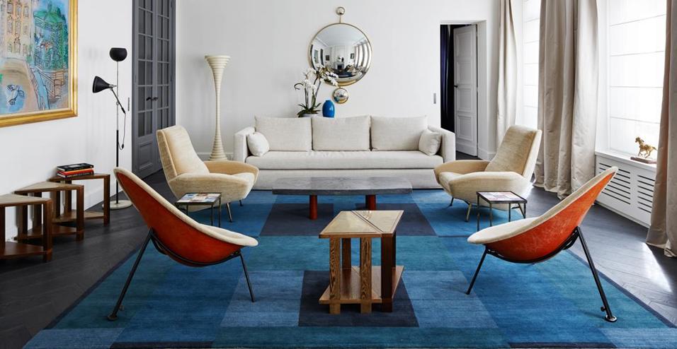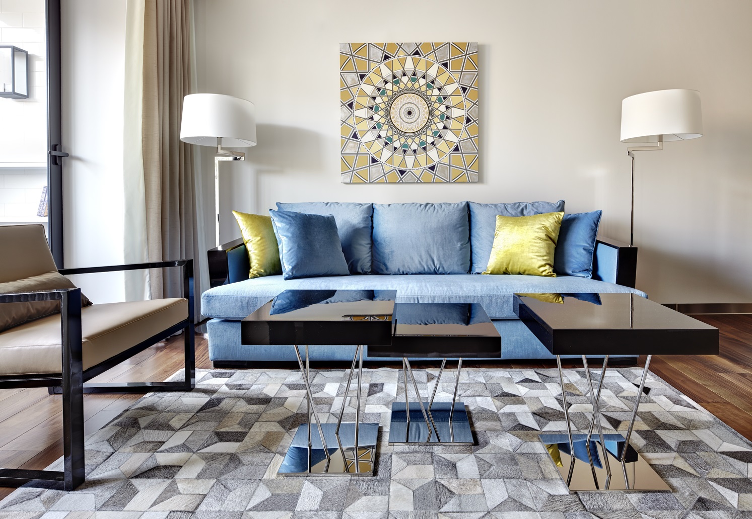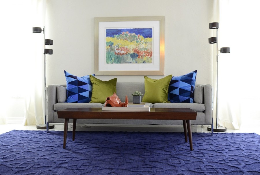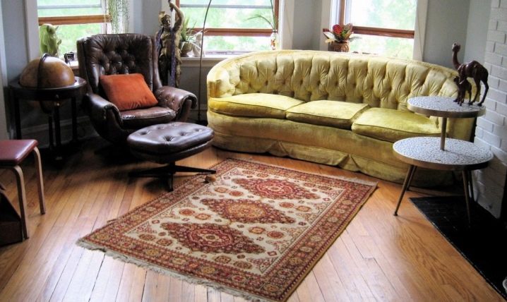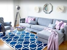 - Wenn der Teppich ein geometrisches Muster hat, bedeutet das nicht, dass die Möbel eintönig sein sollten. Idealerweise wird die Richtung der Linien auf dem Teppich und dem Sofa in einer Richtung sein, so dass sie sich gegenseitig fortsetzen.