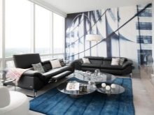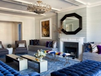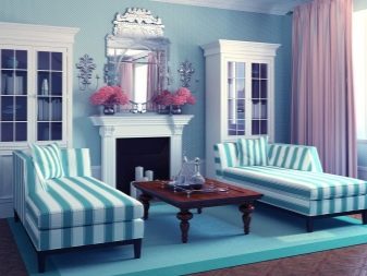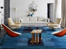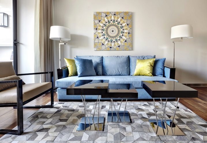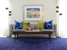 Teppiche in dieser Farbe sind sehr praktisch. Sie sind nicht zu leicht verschmutzt, aber gleichzeitig sind sie nicht dunkel. Blau macht den Innenraum frisch und kalt. Solch ein Teppich kann sicher in einem heißen und sonnigen Raum verlegt werden, dessen Fenster nach Süden weisen. Es wird perfekt mit weißen Möbeln und unlackierten Stühlen und Tischen aus Holz kombiniert.