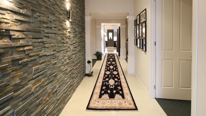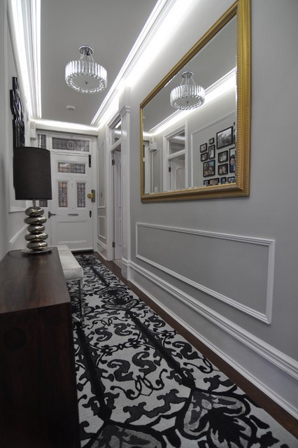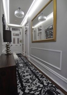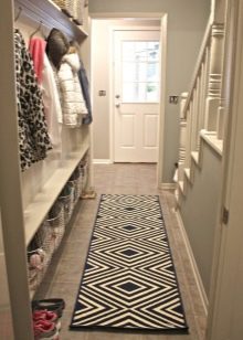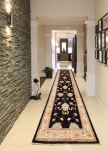 Für den Flur oder langgestreckten Flur eignet sich am besten Teppich. Am Eingang der Wohnung sollte es sich um ein dunkles Modell mit kurzem Nickerchen handeln. Aber wählen Sie keine einfachen Farben. In der Regel haben die Flure in den Wohnungen kein natürliches Licht, daher sollte zumindest auf den Seiten ein Lichtmuster auf dem Teppich vorhanden sein. Wenn Sie einen Teppich mit Teppichboden zwischen den Räumen verlegen möchten, wo sie nicht in Außenschuhen laufen, können Sie eine leichtere Option mit einem höheren Stapel wählen.