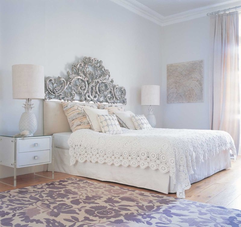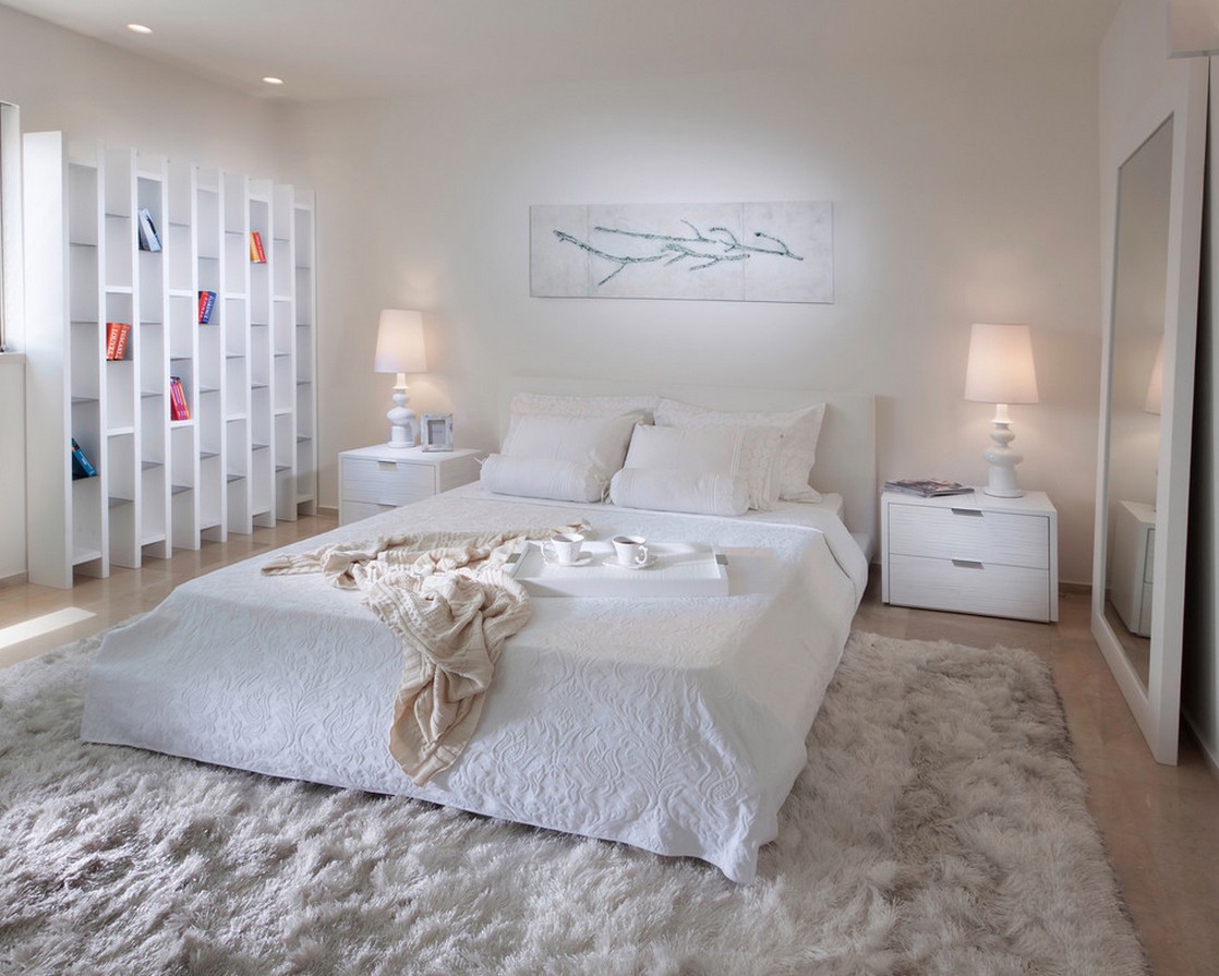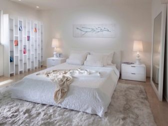 Wählen Sie für Schlafzimmer in der Regel leichte Teppiche mit mittleren oder langen Nickerchen. Je nach Interieur sind beigefarbene Töne für diesen Raum geeignet, alle pastell- und pudrigen Farbtöne.
