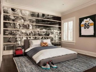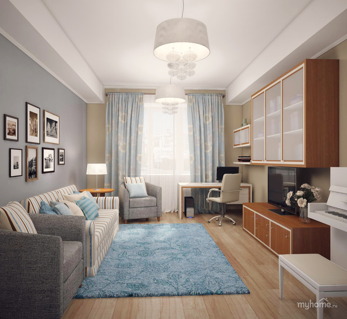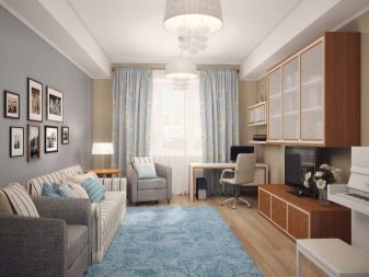 - Unterstützung Dies ist die einfachste Methode, die jede Hostess machen kann. Verdoppeln Sie einfach die Schatten des Teppichs in den Vorhängen und Kissen. Das Zimmer wird sofort ein fertiges Aussehen finden.