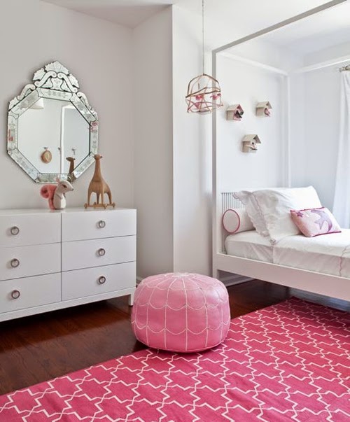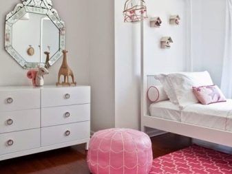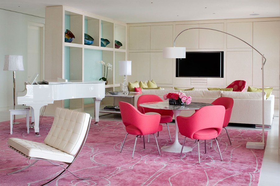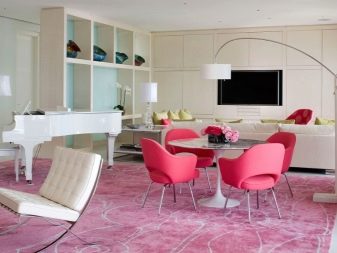 Barbie-inspiriertes Aussehen für ein Mädchenzimmer: leuchtend rosa Teppich, weiße Möbel, Stühle mit Ottomanen, Kissen aus Kunstleder oder Kunstpelz. Für das Innere eines Familienschlafzimmers oder eines Wohnzimmers können Sie eine gepinnte rosafarbene Version oder einen Teppich mit klassischen Mustern wählen.