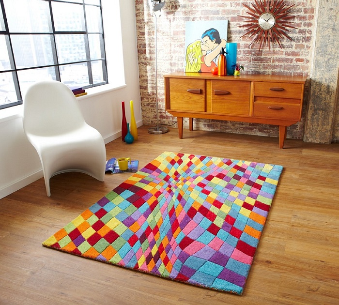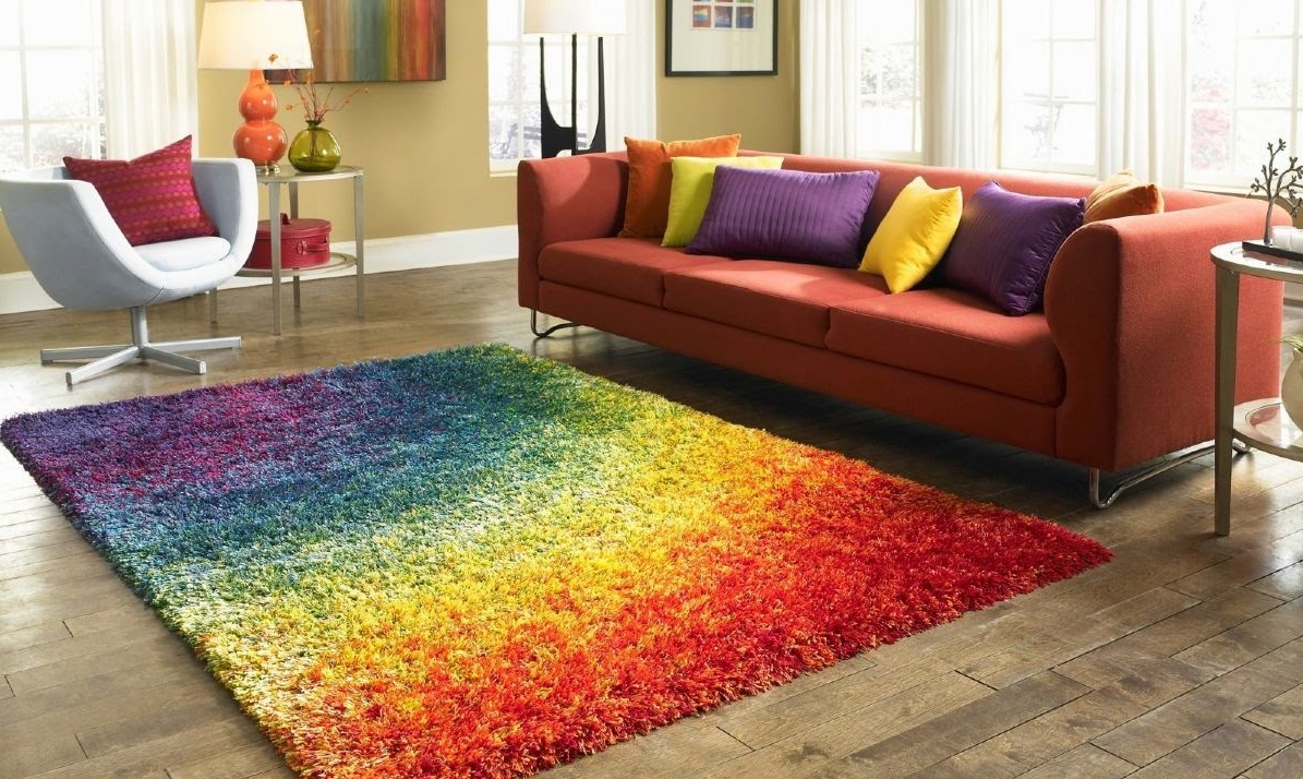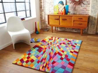 Dunkle Teppiche, wenn es für den Stil geeignet ist, lagen im Wohnzimmer, Flur. An der gleichen Stelle können je nach Design helle Farben (Orange, Gelb, Limette) oder mehrfarbige Modelle auftreten, die mehrere saftige Farbtöne kombinieren. Helle Teppiche eignen sich auch für Kinderzimmer. Es ist nur wichtig, das Alter des Kindes und die Tatsache, dass eine helle Beschichtung zu stark auf die Psyche wirken kann, zu berücksichtigen.