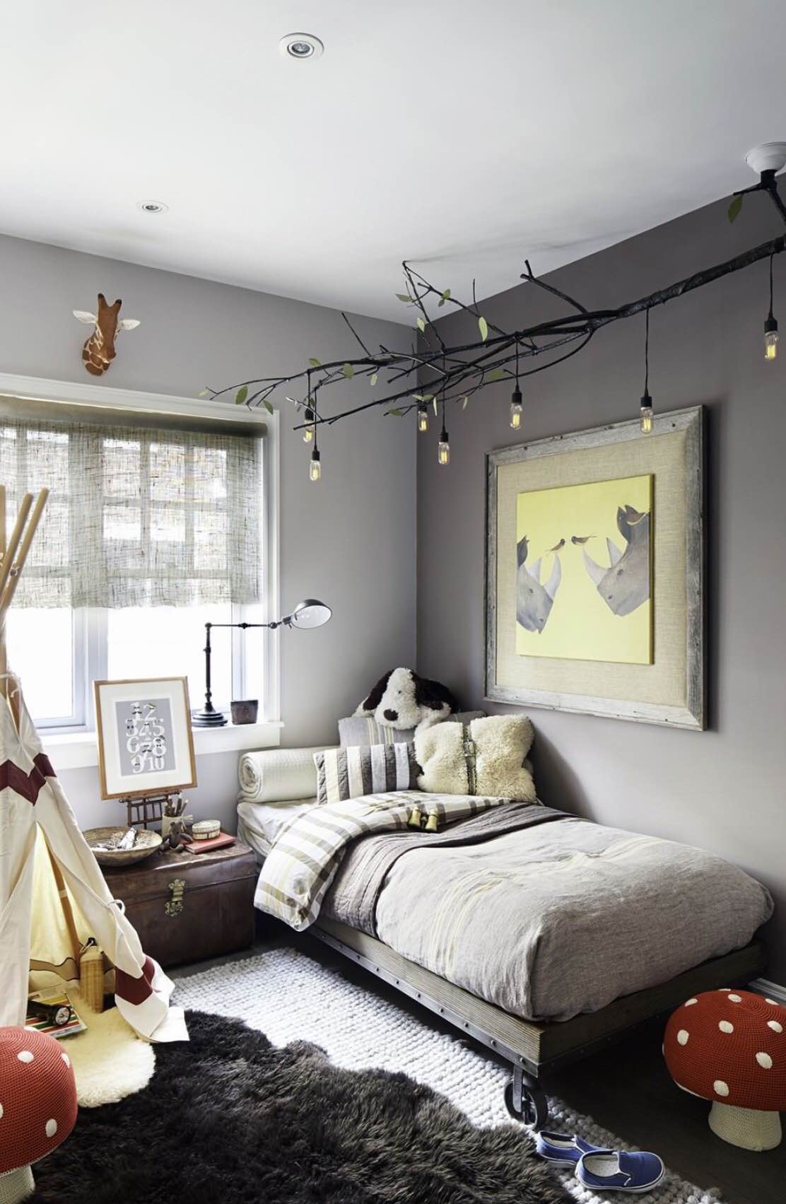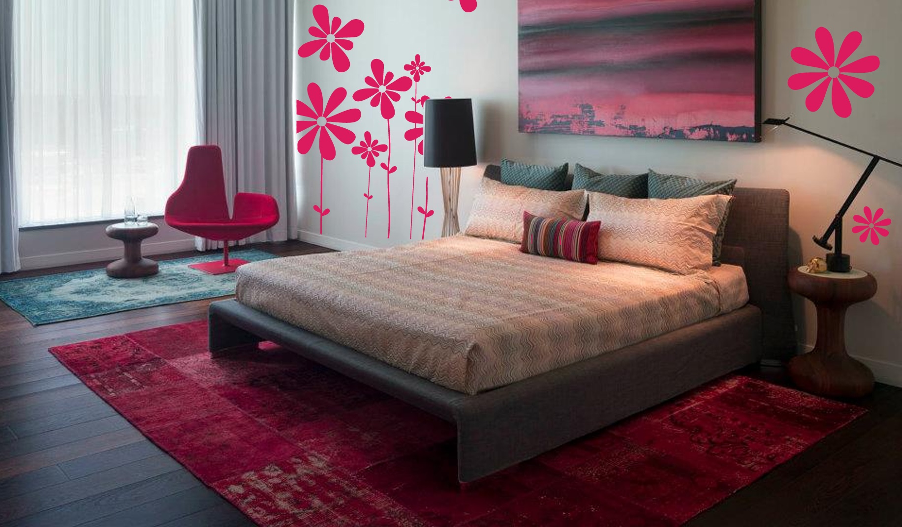 Heller rosa Teppich - nicht nur für Barbie-Stil Zimmer. Wenn Sie die Regeln der Farbkombination kennen, können Sie ein überraschend strenges und gleichzeitig nicht-banales Interieur schaffen. In diesem Schlafzimmer, alle grau - Bett, Wände und Vorhänge. Ein heller Pink-Teppich-Effekt wird durch ein abstraktes Gemälde, naive Tapetenaufkleber und einen Sessel ergänzt. Der Bereich des Stuhls wird übrigens durch einen zusätzlichen blauen Teppich mit sehr kaltem Farbton hervorgehoben.