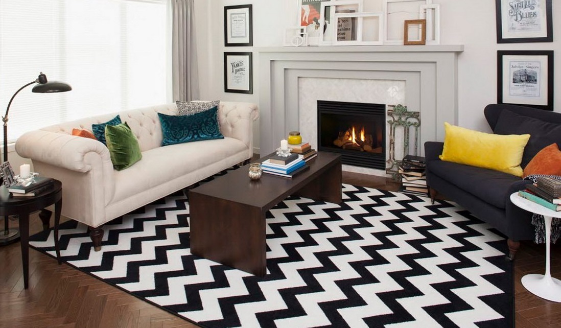 Kontrast Stile. Das Zimmer im Retro-Stil: gemütliche Sofas, ein Kamin, eine Lampe "Antik". Ein großer bicolor Teppich mit einem Muster in Form von Zickzack verleiht Modernität und Dynamik. Schwarz-Weiß-Bild verdünnte helle Flecken von Kissen auf den Sofas. Wenn sie nicht dort wären, hätten sie seine Augen von diesem ursprünglichen Teppich geblendet.