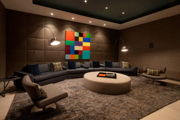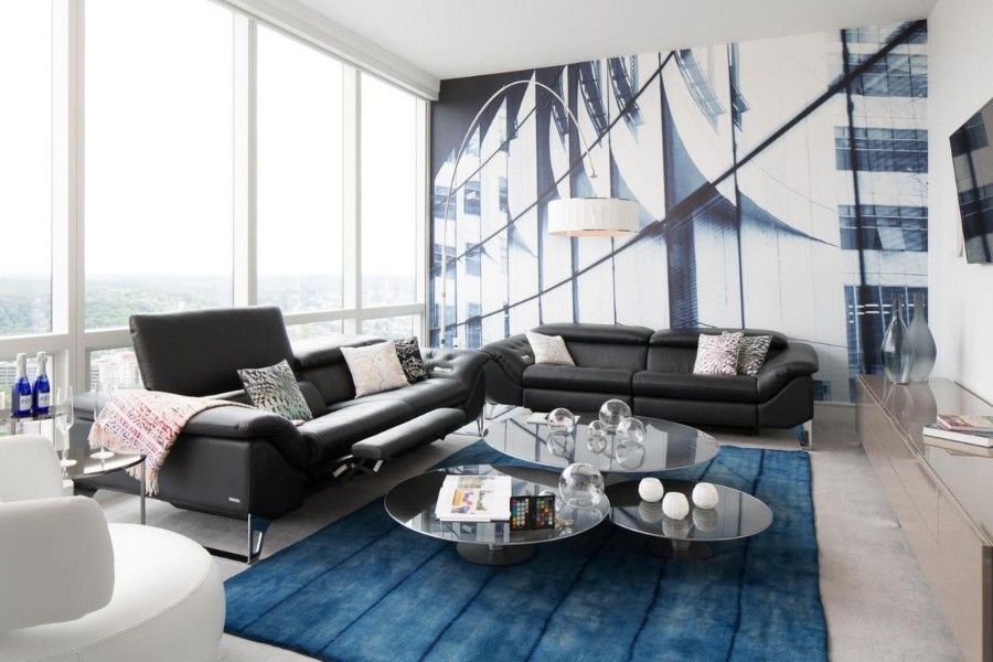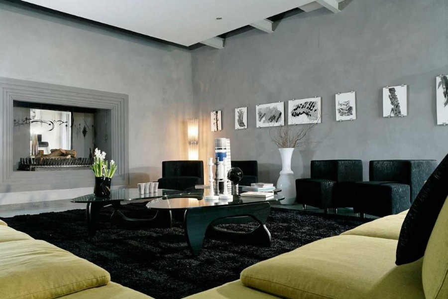 Monochromer schwarzer Teppich ist in High-Tech-Innenräumen zu sehen, in Zimmern mit minimalistischem Design. Das kann zottig sein, Teppichhaut, Matte. Richtig ausgewähltes schwarzes Teppichmodell wird sehr beeindruckend und Status aussehen!