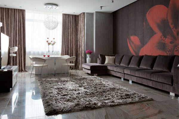 Eine universelle Farbe, die in fast jeden Raum passt und jedem Stil passt. Der braune Teppich ist nicht so skurril in der Pflege, wie schwarz, während es ziemlich dunkel und solide aussieht.