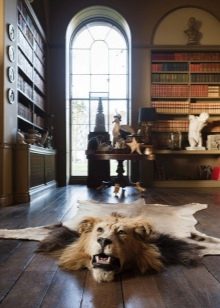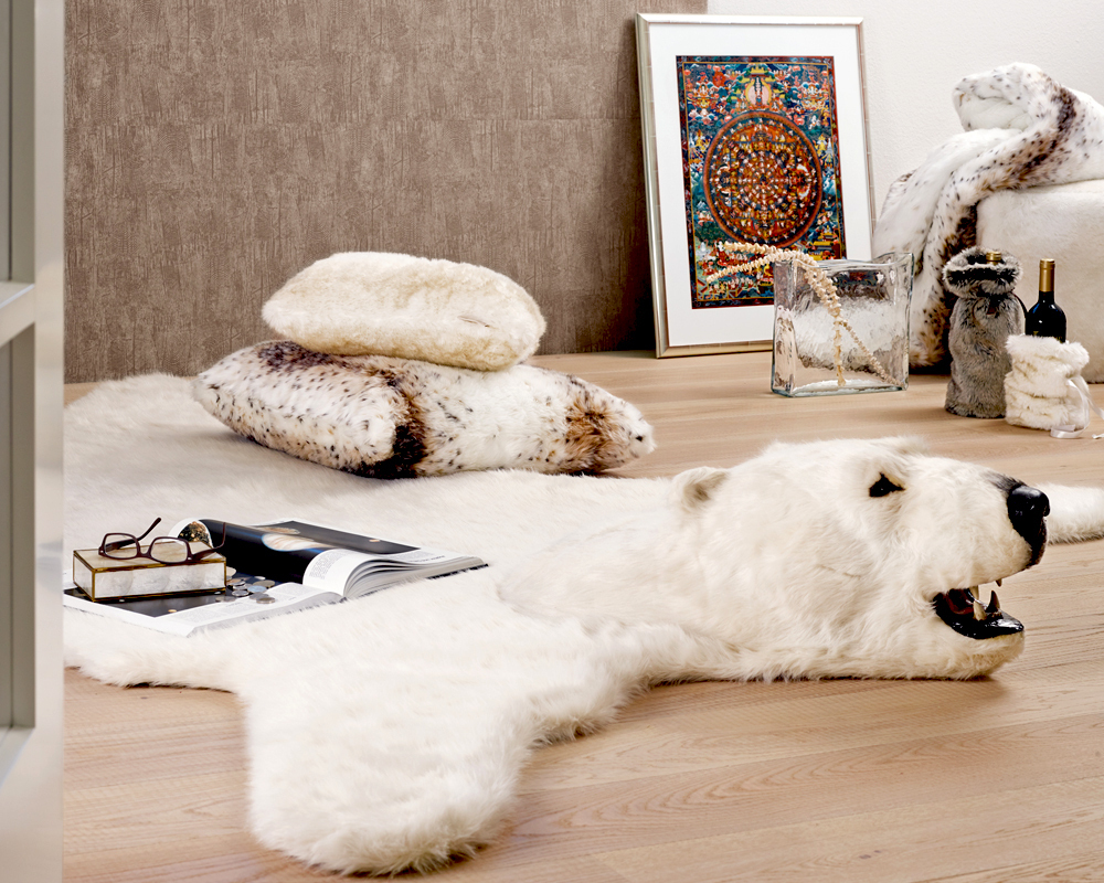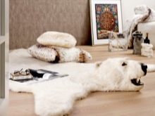 - Vom Bären - Dies ist eine ernsthafte und ziemlich beeindruckende Eigenschaft für die Dekoration des Bodens. Die Haut und das Fell eines Bären zeichnen sich durch Steifigkeit, Dichte, Festigkeit und erhöhte Wärme aus. Sowohl weiße als auch braune Bärenhäute werden verwendet. Solch ein Attribut wird eine wundervolle Dekoration sein, zum Beispiel für das Innere eines Wohnzimmers, das im Öko-Stil gemacht ist oder einem Jagdhaus ähnelt.