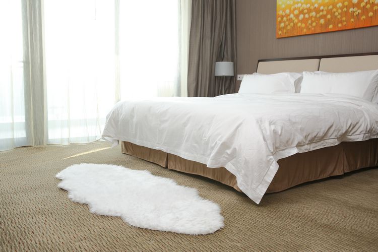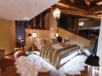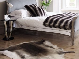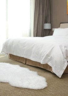 - Teppiche, die sich durch einen langen Flor auszeichnen, zum Beispiel die Häute von Schafen, Ziegen oder Bären. Solch ein Attribut wird eine ausgezeichnete Lösung für ein Schlafzimmer sein, da es sehr angenehm und bequem ist, mit bloßen Füßen weiterzugehen.