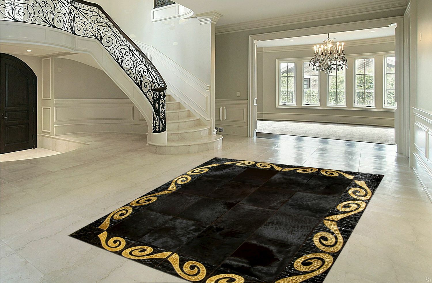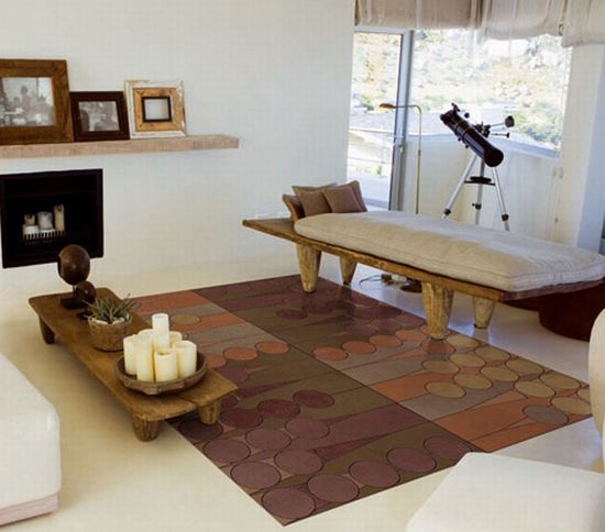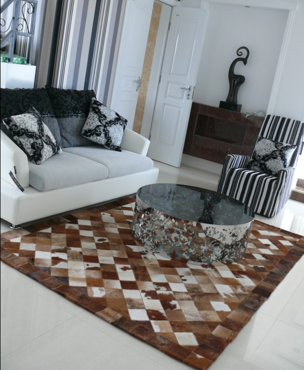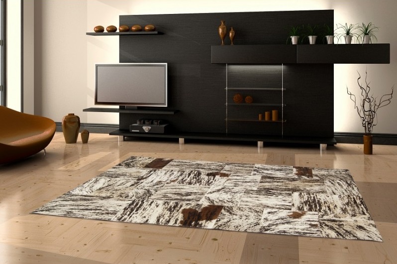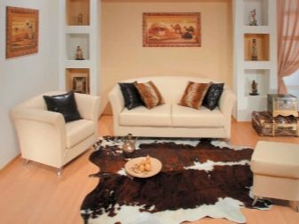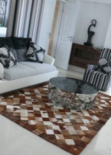 - Für Wohnzimmer Die beste Option wäre ein Bodenbelag aus Kuhfellen, der mit Patchwork-Technologie hergestellt wird.