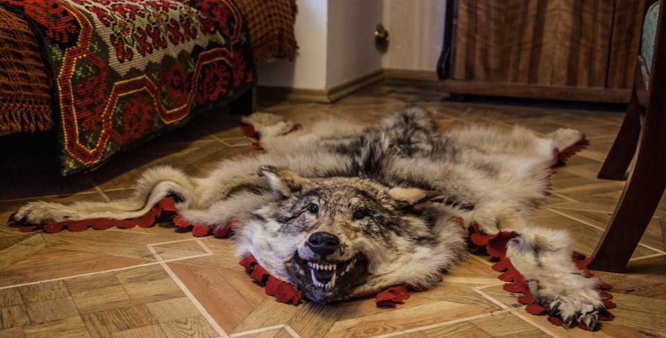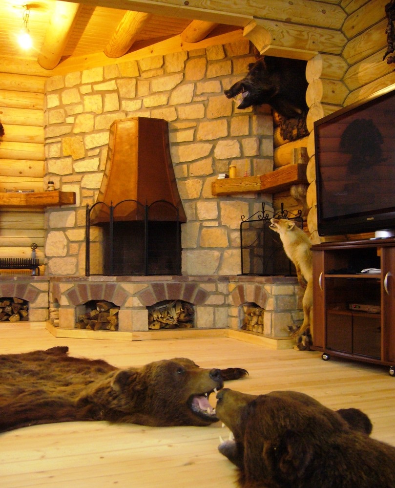 - Im Büro, Billardzimmer Häute in Form eines Wildschweins, eines Bären oder eines Wolfes mit Kopf und Beinen sehen gut aus;