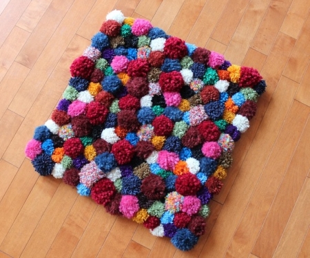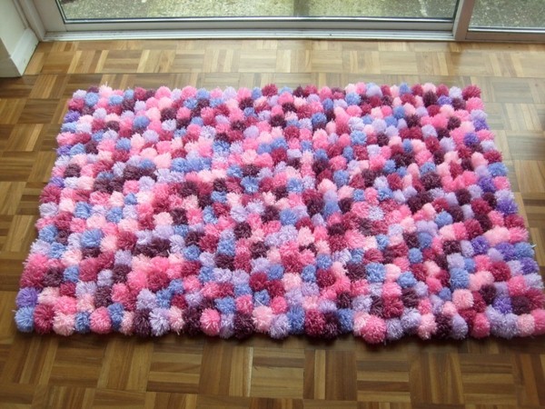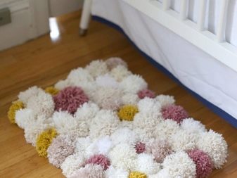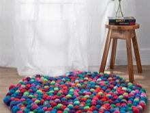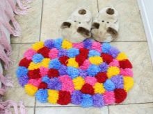 Teppich aus Pompons kann unabhängig gekauft oder hergestellt werden. Und obwohl es bei solchen Arbeiten nicht so viele Schwierigkeiten gibt, braucht es viel Zeit, um so etwas zu schaffen.