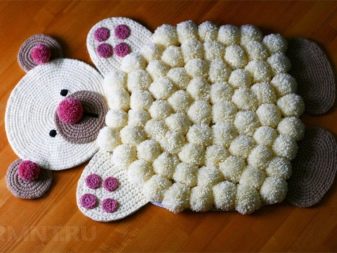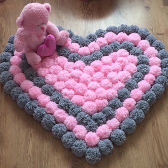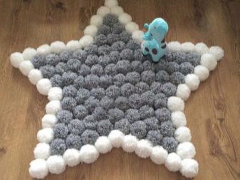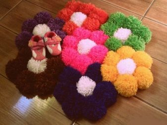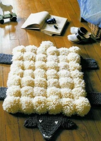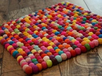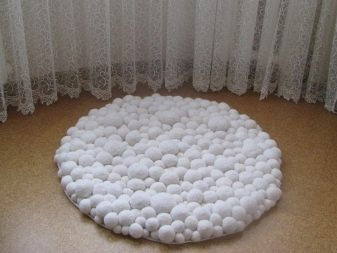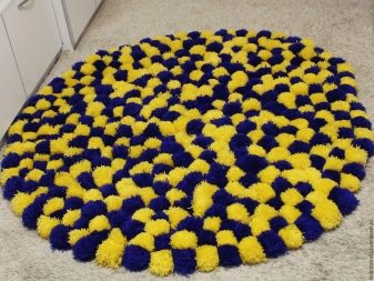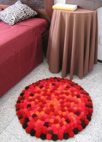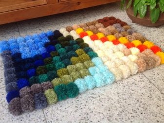 Teppiche aus Pompons sind gut, weil sie verschiedene Größen, Formen und Farben haben können. Pompons werden vom Stricken und Fetzen gefunden. In jedem Fall wird das Produkt solcher Elemente nicht nur schön, sondern auch einzigartig sein, da zwei identische Teppiche von Pompons nicht sein können.