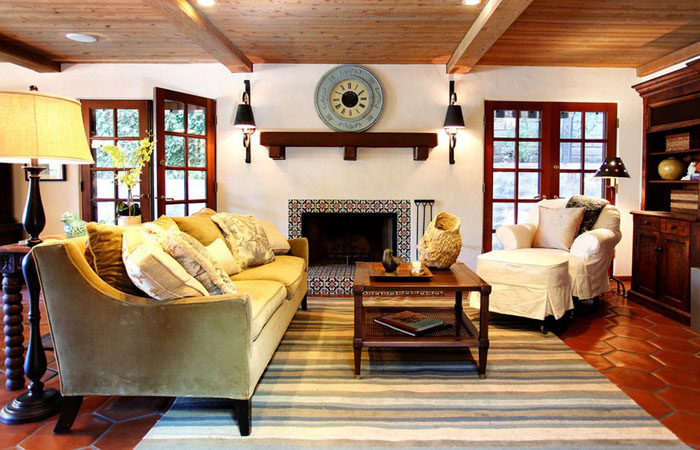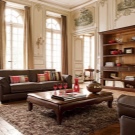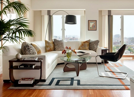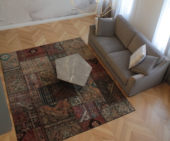 Aber das Wohnzimmer bietet einen großen Spielraum für die Auswahl. Hier können Sie experimentieren und die ungewöhnlichsten und stilvollsten Optionen wählen. Wenn das Innere des Raumes hell ist und Sie es in den gleichen Farbtönen unterstützen möchten, sollten Sie einen beige Wollteppich mit einem geometrischen Muster wählen. Neben der Dekoration wird es auch eine wichtige Funktion der Raumerweiterung tragen.Wenn Sie ein helleres Interieur schaffen möchten, sollten Sie auf den Terracotta-Farbton achten, der seit mehreren Jahren in Mode ist.