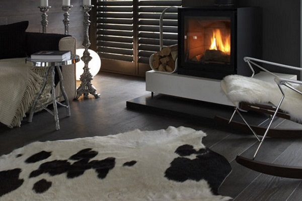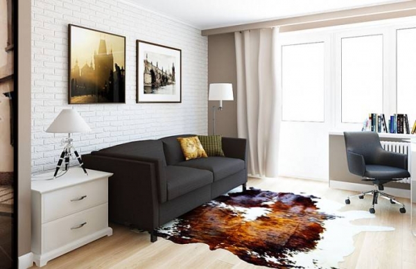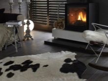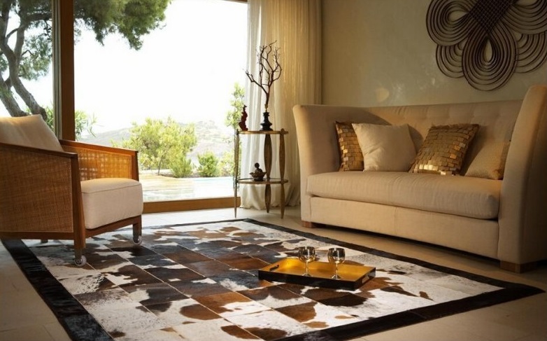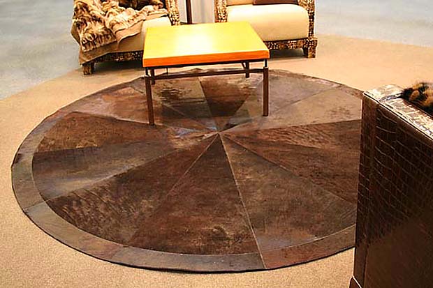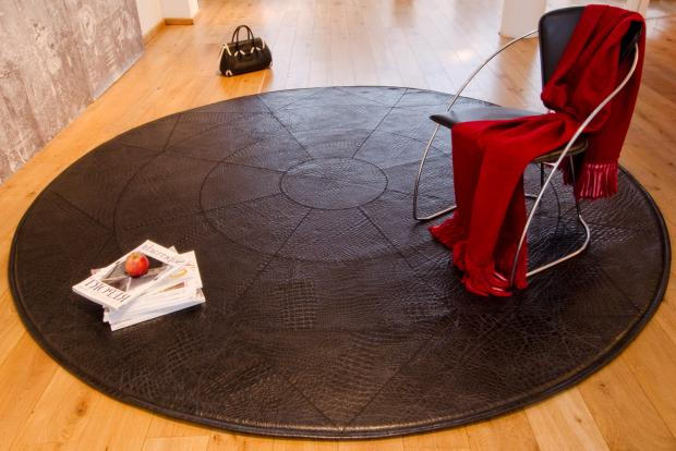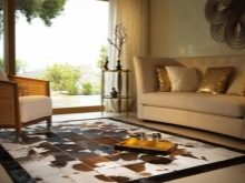 - Haut Solche Optionen sind nicht so gebräuchlich, können aber erfolgreich in den Stil von Loft, Minimalismus oder Modern passen. Diese Teppiche werden durch die Kombination von Lederstücken in verschiedenen Formen hergestellt.