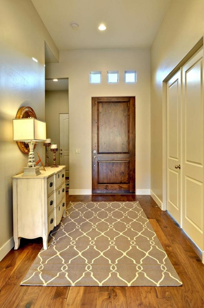 Darüber hinaus haben Modelle bestimmter Materialien auch bestimmte Vorteile. Wenn Sie zum Beispiel eine Wollversion in den Raum legen, wird dies dazu beitragen, die Durchblutung der darauf Gehenden zu verbessern, da Wollfasern eine Fußmassage bieten. Aber der Teppich mit einem kurzen künstlichen Stapel ist für die Reinigung am bequemsten.