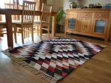 Wenn Sie sich entscheiden, einen Teppich mit einem langen Stapel auf dem Boden in der Küche zu legen, beachten Sie, dass Sie die verschütteten Krümel und den Staub nie vollständig loswerden und zu ihrer endlosen Reinigung verurteilt sind. Eine fusselfreie Version (Matten, Teppiche, Kelims, Sumach) oder im Extremfall ein Teppich mit sehr kurzem Nickerchen ist am besten.