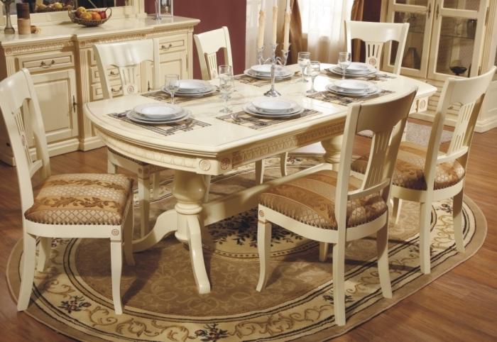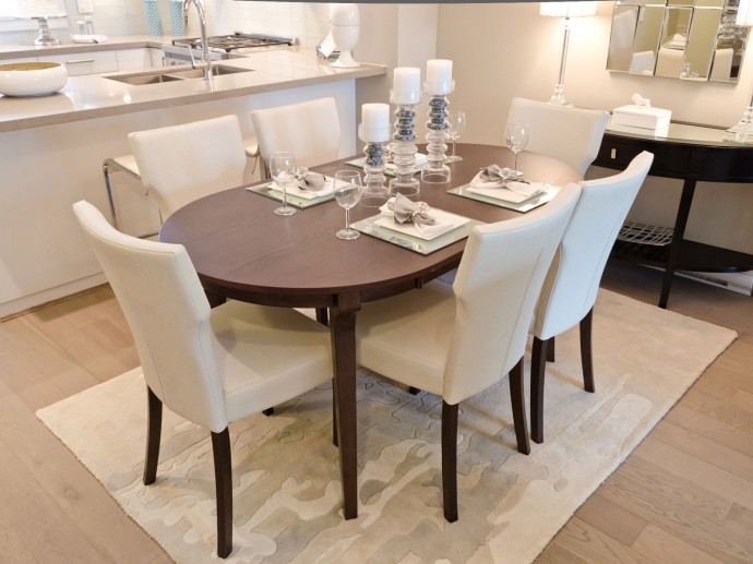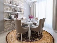 Wenn Sie den Teppich zum Hervorheben des Essbereichs verwenden möchten, beachten Sie, dass die Parameter auf jeder Seite um mindestens 60-70 cm größer als die Tischgröße sein sollten, damit Sie die Stühle frei bewegen können.