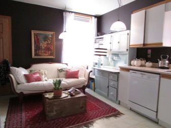 - Die Küche ist ein Ort, wo Leute oft hingehen.Wenn der Boden abgenutzt ist und sein Aussehen verloren hat, und Reparaturen aus irgendeinem Grund nicht bald, kann der Teppich die Rolle seiner hübschen Verkleidung spielen.