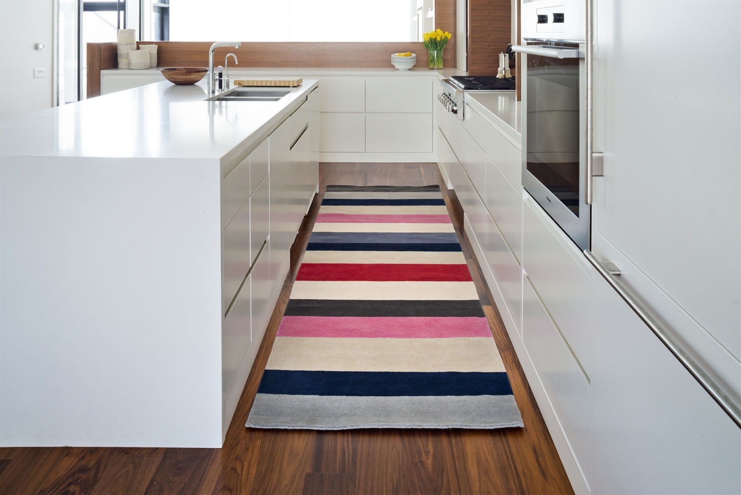 - Wenn Ihre Küche einen kalten Fliesenboden hat, kann der Teppich es buchstäblich und bildlich wärmer und komfortabler machen und die Geräusche dämpfen.