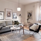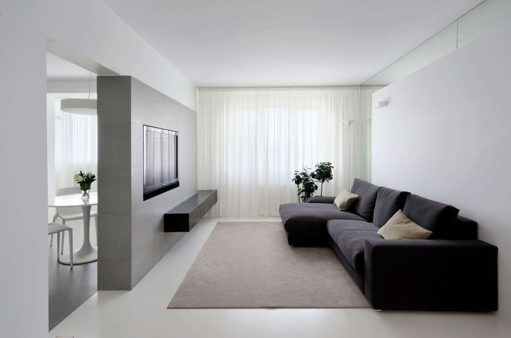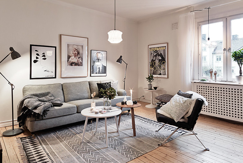 In skandinavischen Wohnzimmern Sie können eine dünne, fusselfreie Teppichmatte mit leichtem Schatten auflegen, oder Sie wählen eine weichnackige Haut und legen sie nicht unter die Möbel, sondern nur zum Gehen, zum Beispiel zwischen einem Sofa und einem Fernseher.