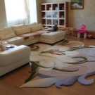 Die Wohnräume in der Wohnung sind in der Regel nicht sehr groß, so ist die beste Lösung, den Teppich in der Mitte zu legen.Wenn es fast die gleiche Größe wie der Raum hat, gibt es keine anderen Optionen. Diese Option ist universell und gleichzeitig langweilig, nicht jeder wird es mögen.