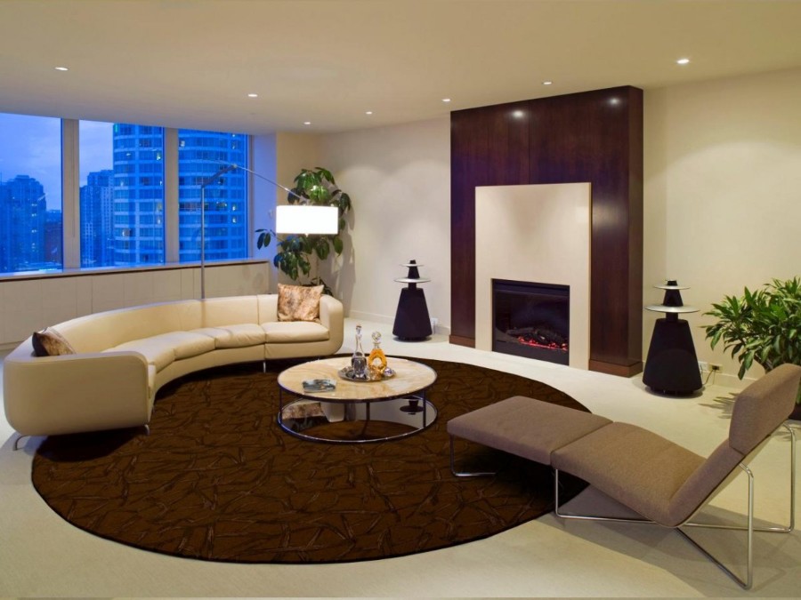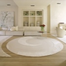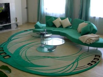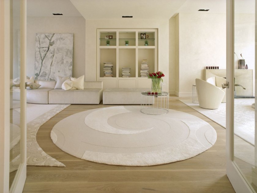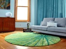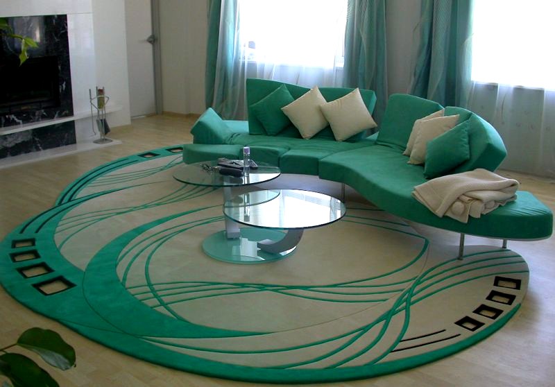 Geglättete Formulareim Gegenteil, aufgrund der Wirkung der weichen Verpackung, sind sie in der Lage, den Raum größer zu machen, um seine Fläche zu erweitern. Nach diesem Modell gleitet der Blick frei, ohne in Ecken zu stoßen. Runde Teppiche mit einer wellenartigen Kante werden im Allgemeinen als harmonischer wahrgenommen.