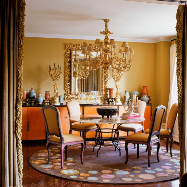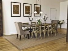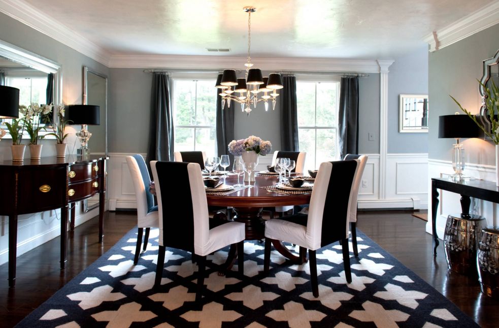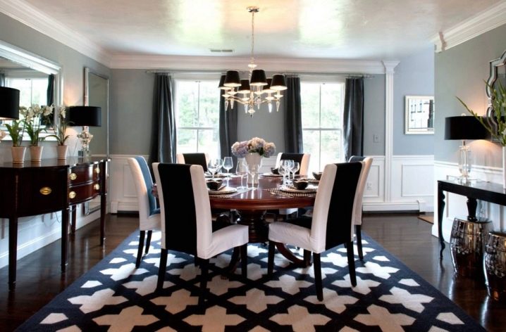 Im kombinierten Esszimmer ist ein Teppich zu finden, der der Form des Tisches folgt und ihn direkt unter den Tisch stellt. Dies wird helfen, die Aufmerksamkeit auf den Essbereich zu lenken und gleichzeitig es den Gästen zu ermöglichen, sich während des Essens wohler zu fühlen.