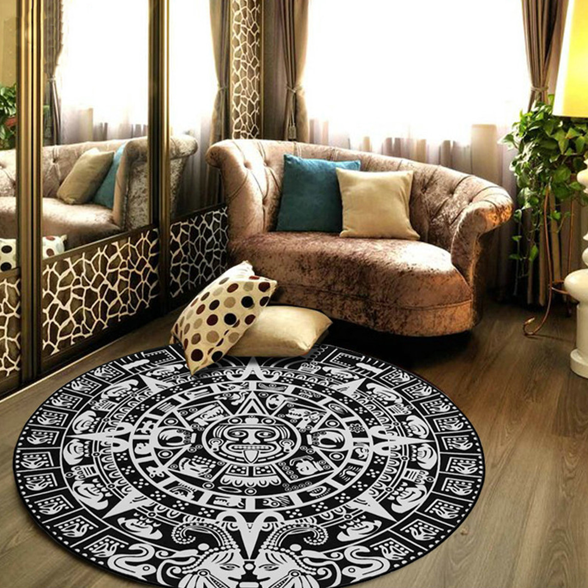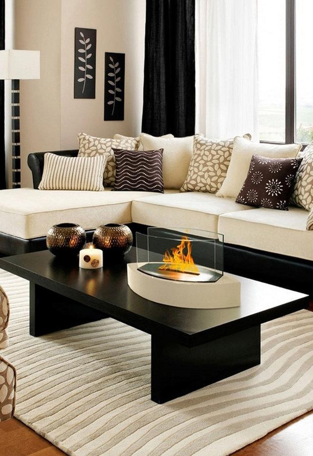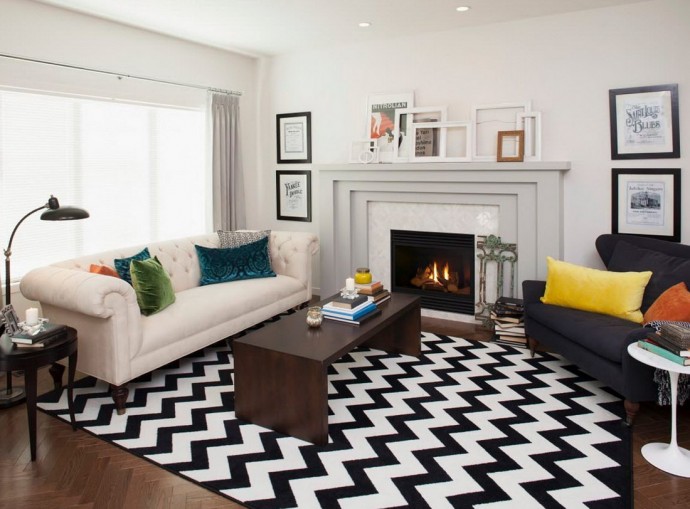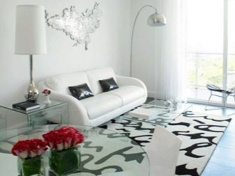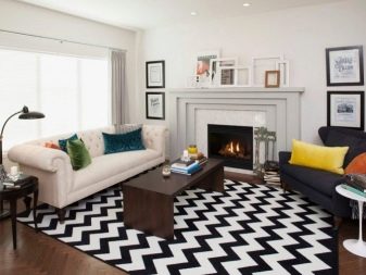 - Teppich mit Ornament sieht interessant aus, wenn es vor dem Sofa platziert wird. Spiegelverlaufsmuster verbirgt visuell den Raumbereich aufgrund der Anordnung von schwarzen Elementen an den Seiten.