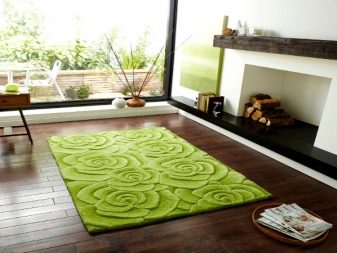 - Der ungewöhnliche Öko-Stil Teppich sieht aus wie eine moosige Lichtung. Hier ist ein gutes Beispiel, wenn die Betonung auf Farbe (verschiedene Grüntöne), Textur (Stapel von verschiedenen Längen) und Form (Wellenkante) liegt. Verwenden Sie zusätzliche Elemente des Dekors, zusammen mit einem ähnlichen Teppich ist es nicht wert, besteht die Gefahr, den Raum zu überlasten.