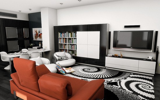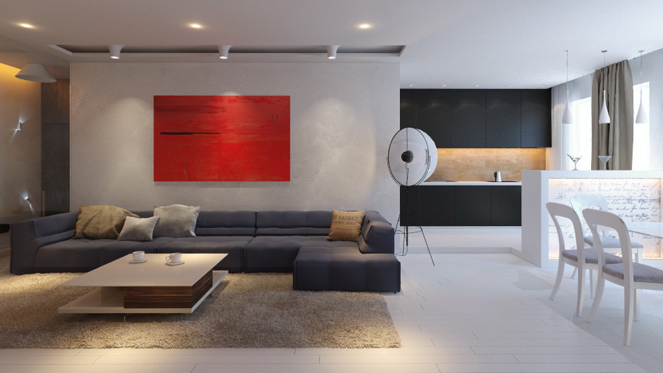 Um ein Wohnzimmer von mehreren Zonen visuell zu unterteilen, können Sie für jeden Bereich Ihren eigenen Teppich mit verschiedenen Texturen und Farben wählen und ihn je nach der Lage der Hauptmöbel einer bestimmten Zone, zum Beispiel auf dem Boden vor einem Fernseher oder Sofa für ein Erholungsgebiet, einrichten.unter dem Stuhl für den Lesebereich, vor dem Sofa für den Schlafbereich und so weiter.