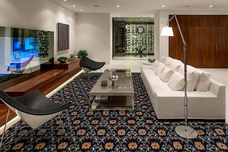 Für kühle Räume oder Räume, in denen Kinder spielen, ist es ratsam, große Teppiche zu kaufen. Solche Varianten führen eine wärmeisolierende und geräuschisolierende Funktion um den gesamten Umfang des Wohnzimmers durch. Modelle helfen dabei, die Geräusche von Laufen und Kinderspielen vor den Nachbarn zu verbergen und sie so vor Unannehmlichkeiten zu schützen.