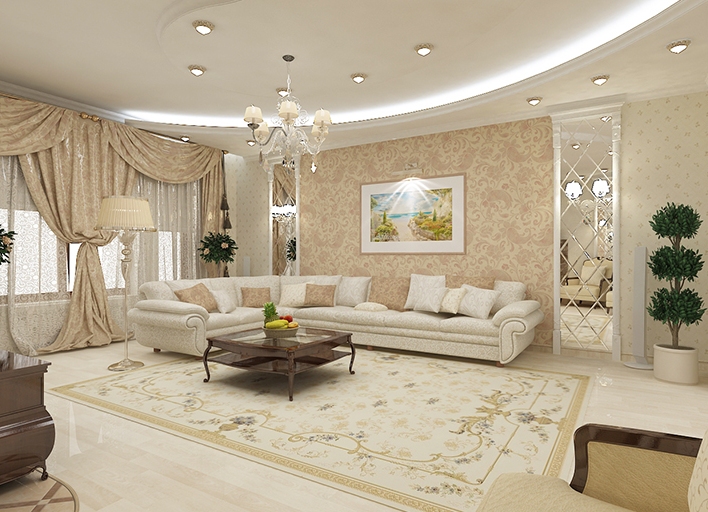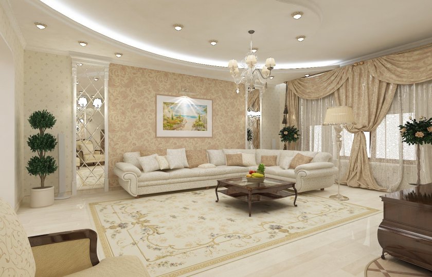 Sie müssen ehrlich die Größe des Raumes erkennen. Optionen in dem kleinen Raum sind deutlich begrenzt, während für einen wirklich geräumigen Raum viele verschiedene Modelle vorhanden sind. Drücken Sie die Größe der Möbel ab.Zum Beispiel für einen Satz von Sofa und zwei Sessel und optimale Passform Teppich, auf das die gesamte Zusammensetzung wird Haus geräumig und klein, in der Mitte der angeordneten Elemente befindet.