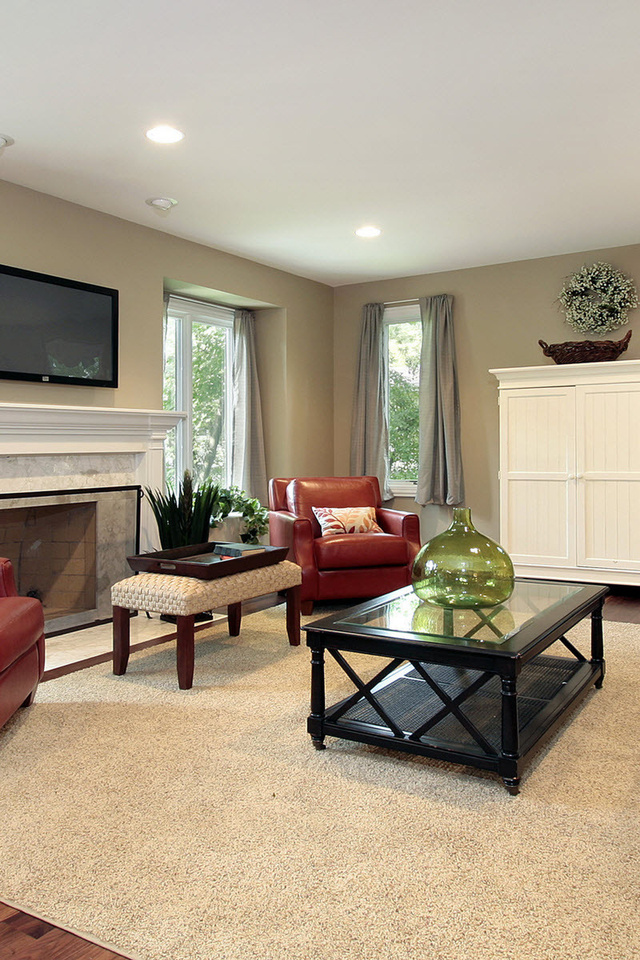 Der Teppich sollte entweder in den gleichen Tönen wie das Wohnzimmer oder im Gegensatz dazu gewählt werden. Im ersten Fall wird der Teppich verwendet, um den Raum zu korrigieren, in der zweiten - um einen Akzent zu schaffen.