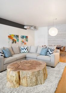 Wenn Sie den Teppich einer ungewöhnlichen Form wählen, vergessen Sie nicht, dass diese Form mit den Möbeln im Inneren perfekt kombiniert werden sollte.