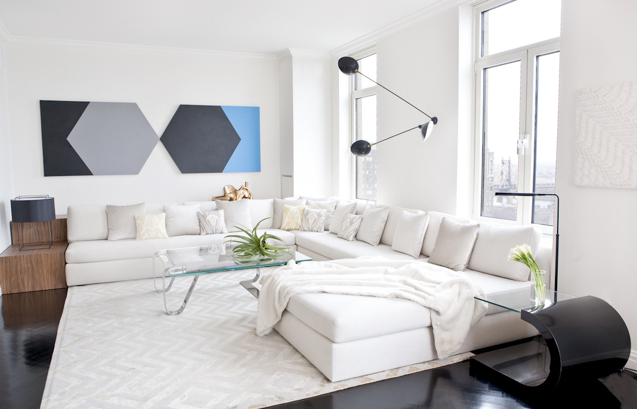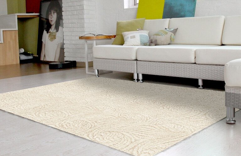 Was die Texturen selbst angeht, wäre eine gute Lösung, den Teppich mit Polstermöbeln und Tagesdecken auf den Sofas zu kombinieren.
