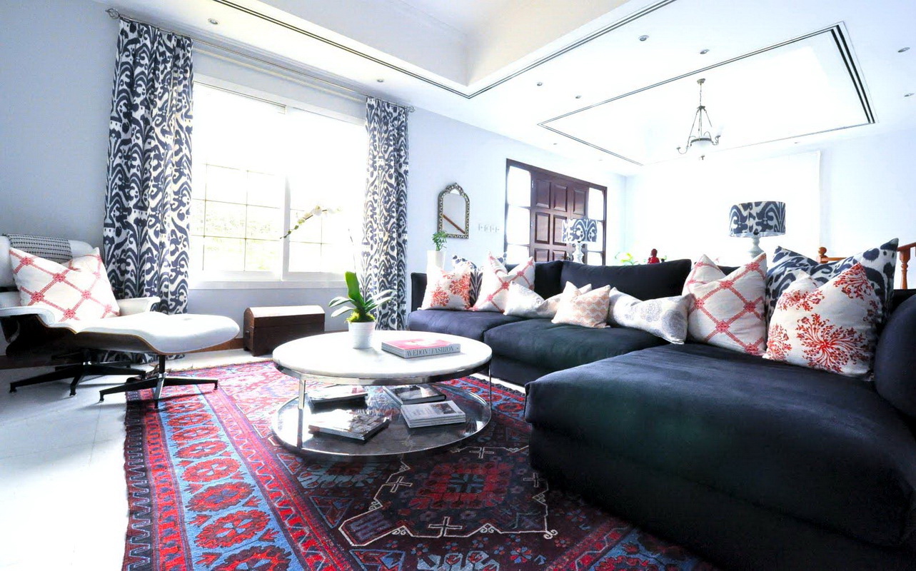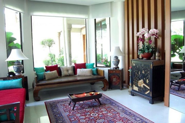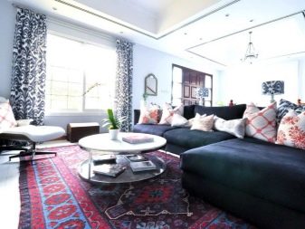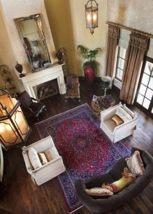 Persische Teppiche werden oft für orientalische Innenräume verwendet. In einer solchen Umgebung sieht die persische Leinwand am harmonischsten aus. Sie können die orientalische Umgebung mit einem Teppich in kontrastierenden Farben ergänzen.