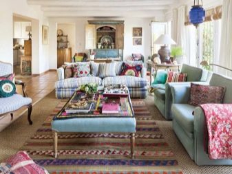 - Nicht ausgeschlossen und Kombination mehrerer Stile. Zum Beispiel, wenn der Raum in hellen Farben dekoriert ist, können Sie einen hellen Teppich auf den Boden legen, der die Monotonie des Raumes verwässern wird. Solch ein Interieur wird definitiv nicht langweilig und verblasst. Die Hauptsache ist, der Farbkombination im allgemeinen Stil zu folgen, und dann werden Sie ein harmonisches und gemütliches Zimmer schaffen, in dem Sie gerne Zeit verbringen werden.