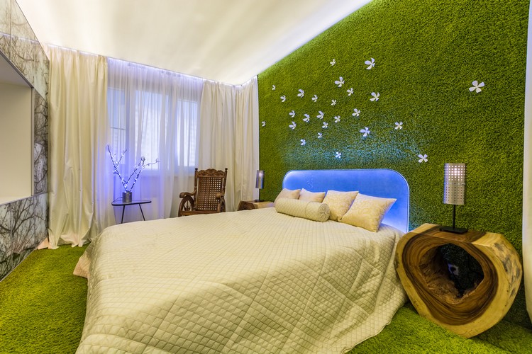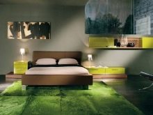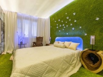 In erwachsenen Schlafzimmern kann ein solcher Teppich aufgrund seiner ästhetischen Funktionen ebenfalls verwendet werden. Es ist perfekt für den Innenraum im Eco-Stil geeignet, wird eine zusätzliche Betonung auf seine ideologische Ausrichtung zu schaffen. Interessanterweise schauen "Rasen" in den Schlafzimmern im Stil von High-Tech: Es ist wie seine hervorgehobene Machbarkeit und seine Ambitionen in der Zukunft widersetzen.
