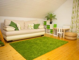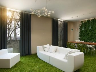 Teppichgras beschränkt den Designer nicht auf die Lösungen. Sie können eine Abdeckung auf dem gesamten Boden im Raum legen. Verwenden Sie dazu Kunstrasen in Rollen. Sie können das Material lokal, in der Mitte oder in bestimmten Zonen anordnen.