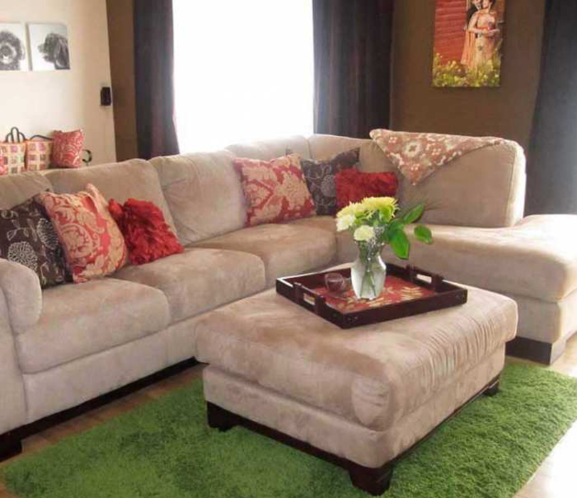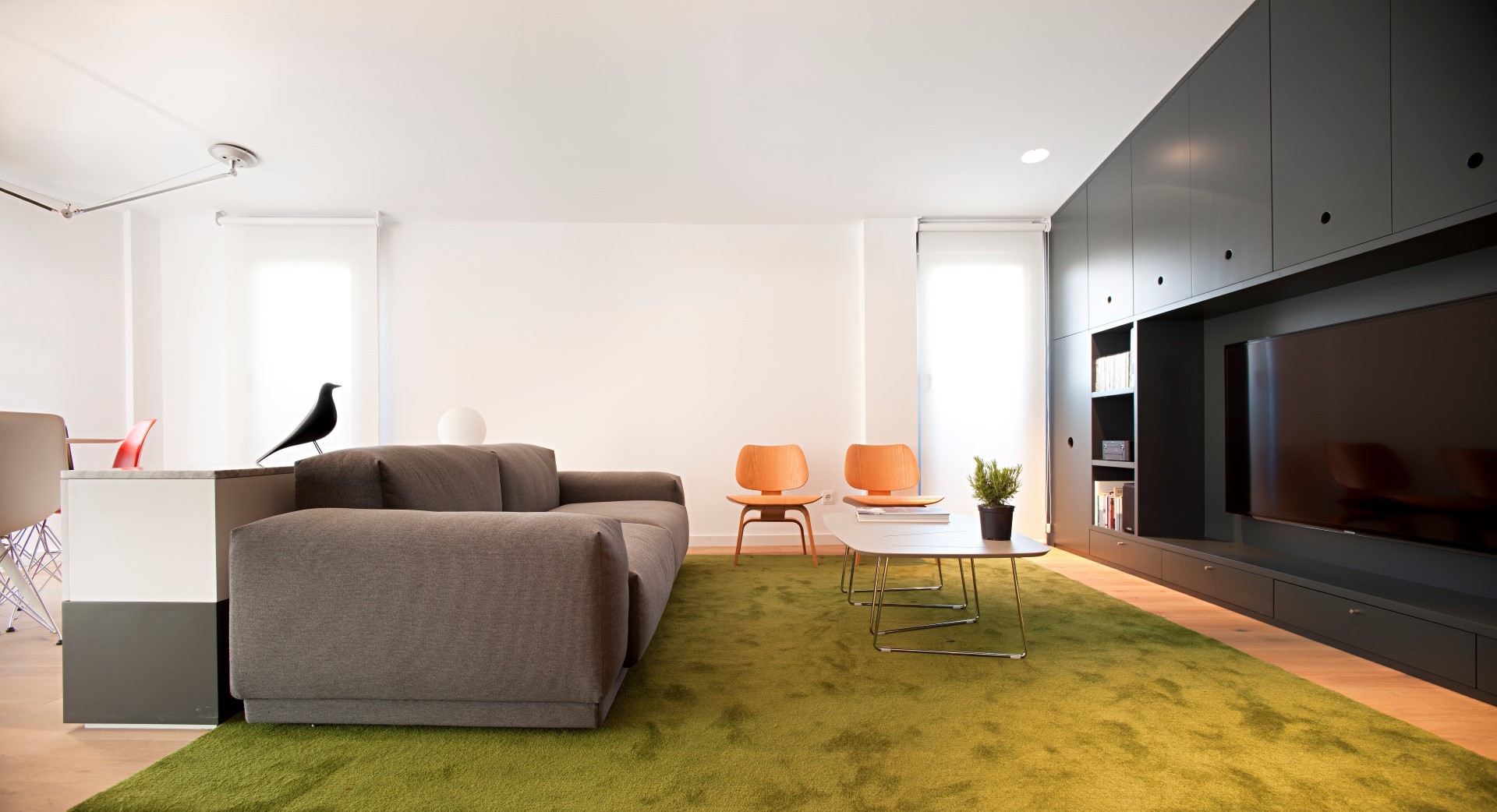 - Rechteckiges Teppichgras im Inneren des Wohnzimmers.