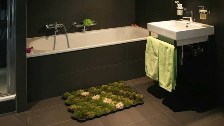 - Teppich in Form von Moos sieht organisch in einem dunklen Badezimmer aus.