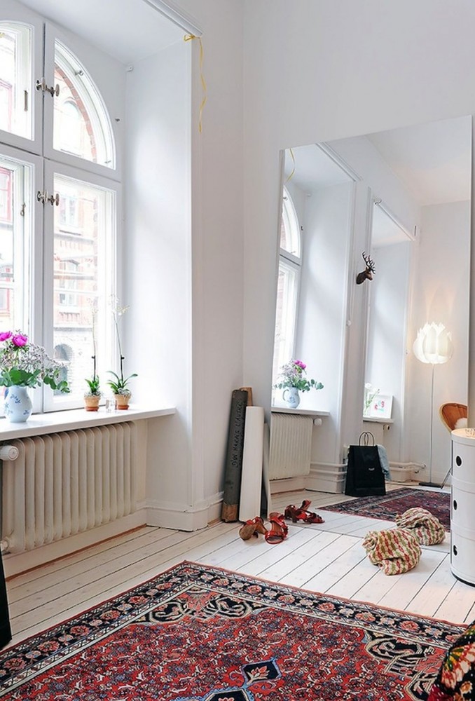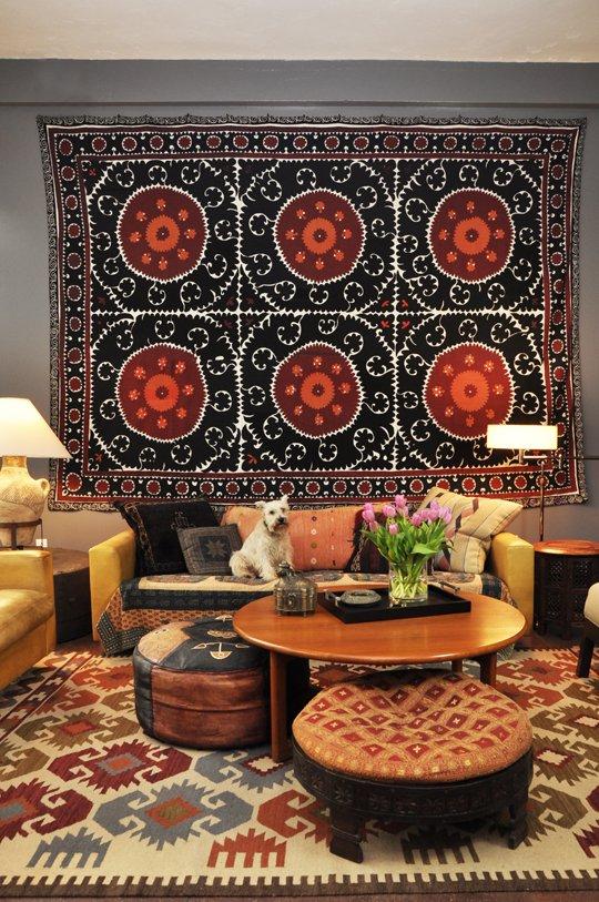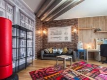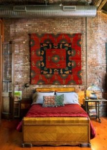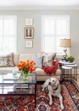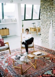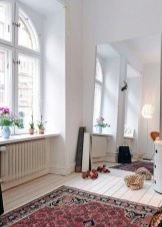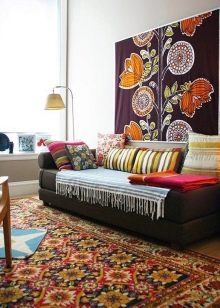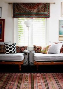 Die dritte Unterbringungsmöglichkeit ist für größere Gebiete besser geeignet. In diesem Fall erhalten die Leinwand genau die Fläche des Raumes und haben alle Elemente der Möbel darauf. So können Sie das ganze Interieur in eine orientalische Atmosphäre tauchen. Auch die Platzierung eines solchen Produkts hängt von seinen äußeren Eigenschaften ab. Wenn es ein eher rauer, fusselfreier Kelim ist, kann er auf den Boden gelegt werden.