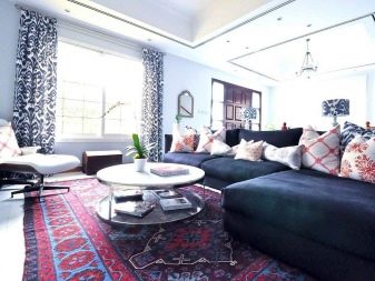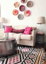 Geometrische Muster und Ornamente auf dem Teppich erfordern etwas Unterstützung im Inneren des Raumes. Um eine harmonische Kombination zu schaffen, ist es besser, andere Accessoires im orientalischen Stil zu verwenden. So ergänzen diese Teppiche meistens die Kissen im östlichen Stil. Es ist besser, wenn solche Produkte nicht völlig identisch sind, sondern das Design und das Farbschema des Teppichs teilweise wiederholen.