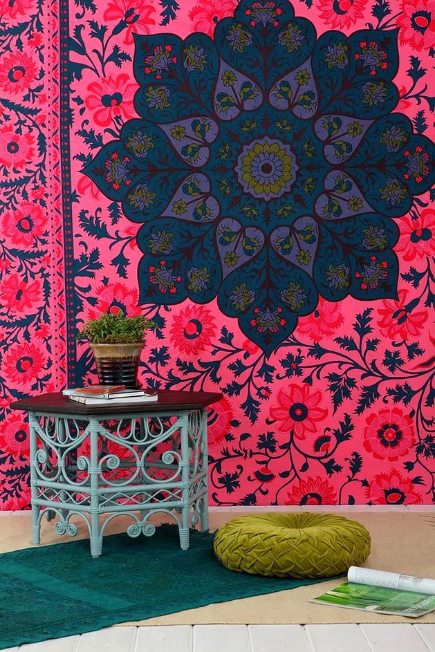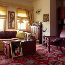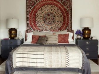 Kissen sind in der Regel in engen Decken aus natürlichen Stoffen eingewickelt, die mit schönen Quasten an den Spitzen der Ecken verziert sind. Solche Produkte werden auch gemacht, um Accessoires im ethnischen und kolonialen Stil zu ergänzen. Eine schöne Ergänzung zum Kelim ist ein Mosaik, das an einer Wand oder an einem anderen Ort angebracht ist. Orientteppiche sind sehr harmonisch mit Holzmöbeln kombiniert.