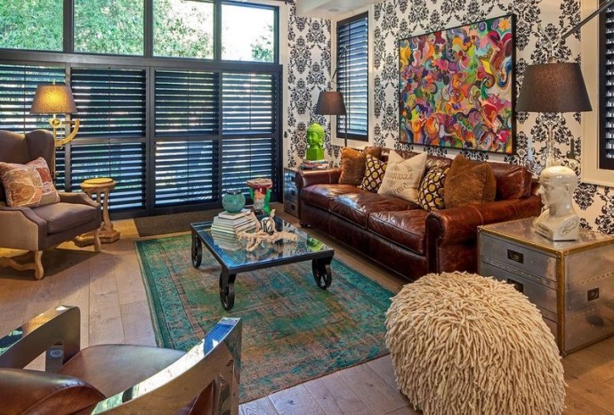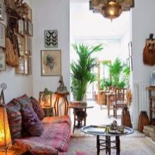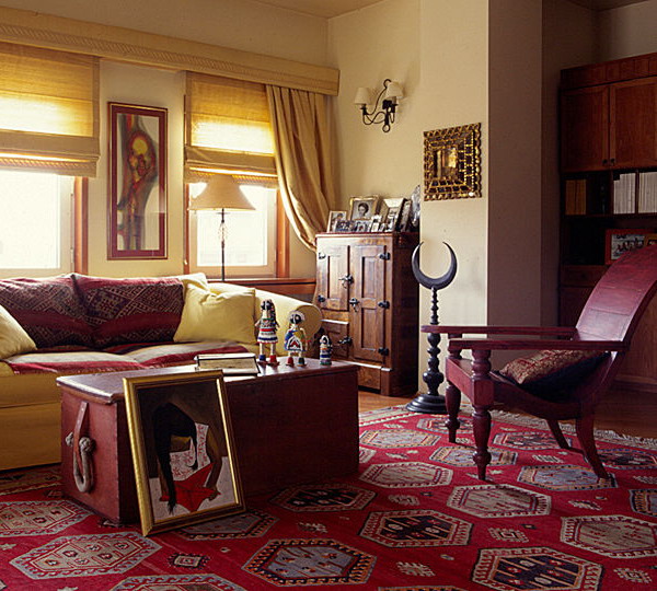 Auch orientalische Teppiche sehen in Kombination mit Lederelementen gut aus. Und das Harmonischste wird als Kombination mit leicht gealterter Haut angesehen. Sie können das Interieur auch im orientalischen Stil mit Korbelementen und Accessoires ergänzen. Sie können im Raum mit einer Leinwand schöne Körbe arrangieren.