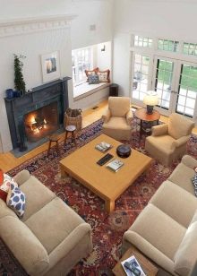 Im ersten Fall wird das Produkt zwischen den Möbeln im Wohnzimmer platziert. Meistens vor ein Sofa oder Stühle gestellt, aber der Teppich fällt nicht unter sie. Auf einem solchen Teppich kann man nur einen Couchtisch stellen.