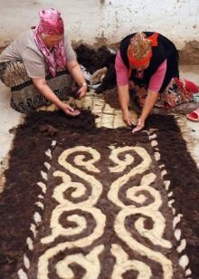 Solche Teppiche zeichnen sich durch ein Ornament in Form von Tier- oder Vogelbildern aus. Einige Produkte haben auch abstrakte geometrische Formen, in denen Sie Bilder von Brettern oder Protokollen sehen können. Diese Produkte werden nur von Hand gefertigt. Meistens sind Frauen mit ihrer Weberei beschäftigt.