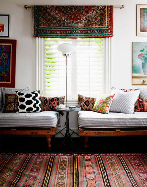 Aber wenn Sie ein exquisites handgemachtes Produkt ohne ein Nickerchen haben, sollten Sie es nicht in den Durchgangszonen legen.Es ist besser, es mit einer Wand zu schmücken oder es auf ein Bett im Schlafzimmer anstatt einer Bettdecke zu werfen. Vergessen Sie nicht, dass der Kelim das zentrale Element des Raumes sein muss, deshalb ist es wichtig, ihn in der Akzentzone des Raumes zu platzieren.